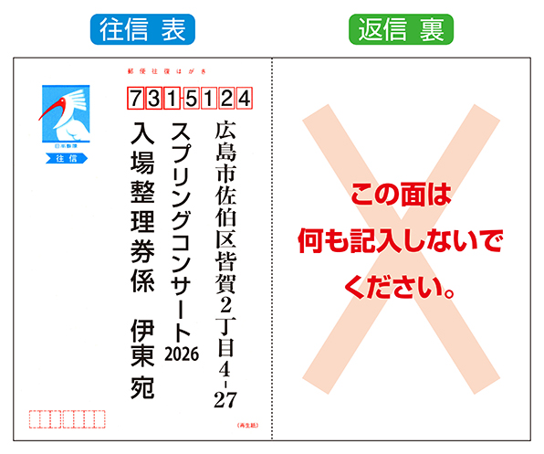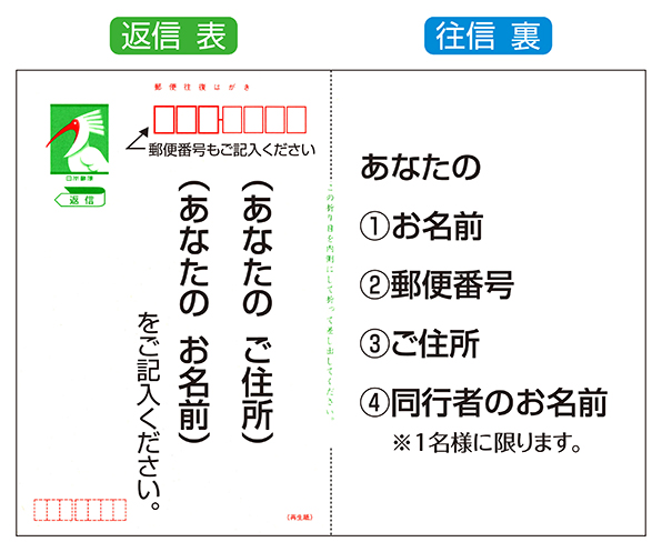 ※2名様希望の場合は、往信裏(上図④)に同行者のお名前(1名様に限ります)を必ずご記入ください。