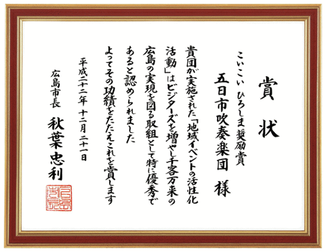 私たち五日市吹奏楽団は2010年12月21日、『広島市こいこいひろしま奨励賞』を受賞いたしました。